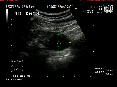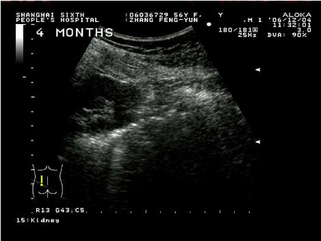 超聲引導下腎囊腫穿刺硬化治療具有簡單易行,患者少痛苦,復發率低,費用低等優點。這種方法是用超聲診斷儀事先選定穿刺點,設計好進針角度和進針深度,在局部麻醉下,用專用的穿刺探頭,根據已設定的角度和深度把直徑0.8毫米或1.2毫米的針插入囊腫,因為囊腫、針道和周圍臟器全部在超聲屏幕上看到,所以不會損傷周圍臟器,待抽凈囊液后,注入硬化劑,使硬化劑與囊腫內壁上皮接觸,達到硬化效果,數分鐘后把硬化劑抽出,拔出穿刺針,整個治療過程安全。在硬化治療后的早期(一個月內),一般說,囊腫上皮因硬化劑燒灼作用,會有滲出,一個月后開始漸漸吸收,三個月后明顯縮小,直至囊腫完全消失。